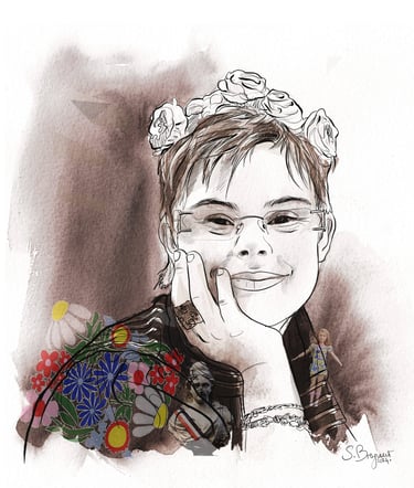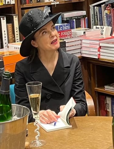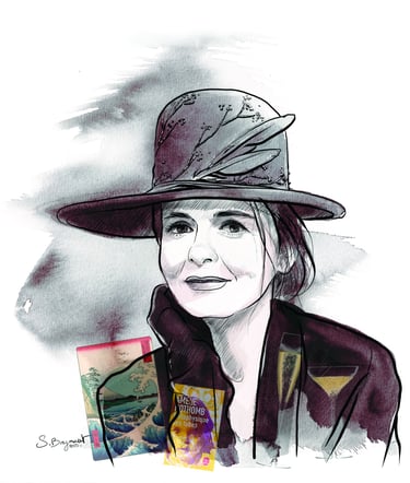 Amélie Nothomb portant le chapeau confectionné par Sabine